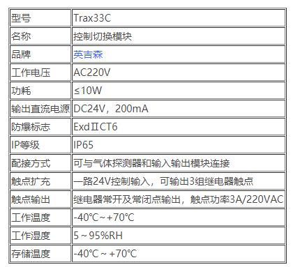 Trax33C控制切換模塊,主要用于有毒、可燃氣體探測器和輸入輸出模塊的控制觸點擴充。Trax33C控制切換模塊主要完成對AC220V的聯動設備的控制。